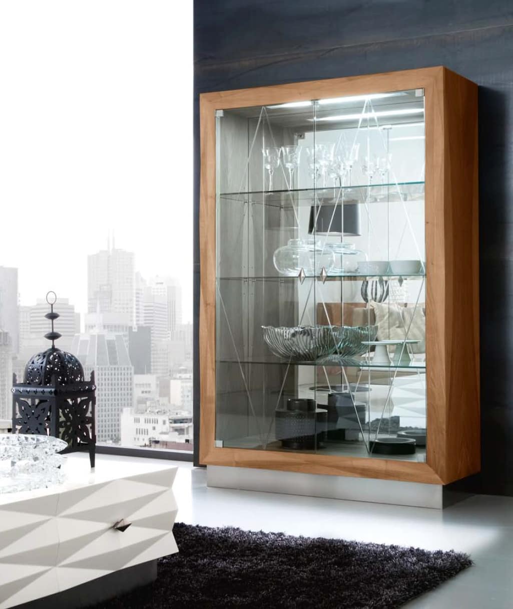 Diaplay Schrank mit 2 Glastüren und Sockel in Stahl, in Natur-Walnuss.