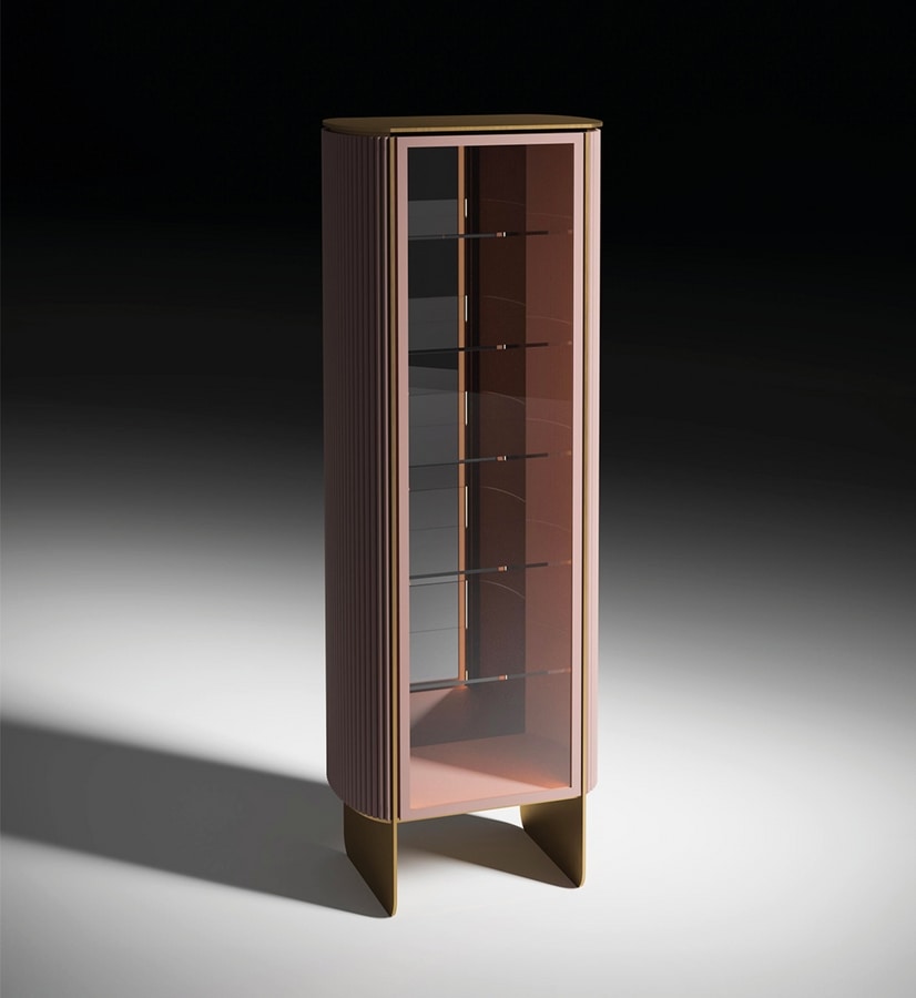 Es besteht aus lackiertem Holz und einer glänzenden Messingoberfläche und ist in zwei verschiedenen Konfigurationen erhältlich: zum Ausstellen (mit einer Glastür) oder zum Verbergen (mit einer lackierten Tür), um Ihre Objekte zur Schau zu stellen oder sie vor neugierigen Blicken zu verbergen.