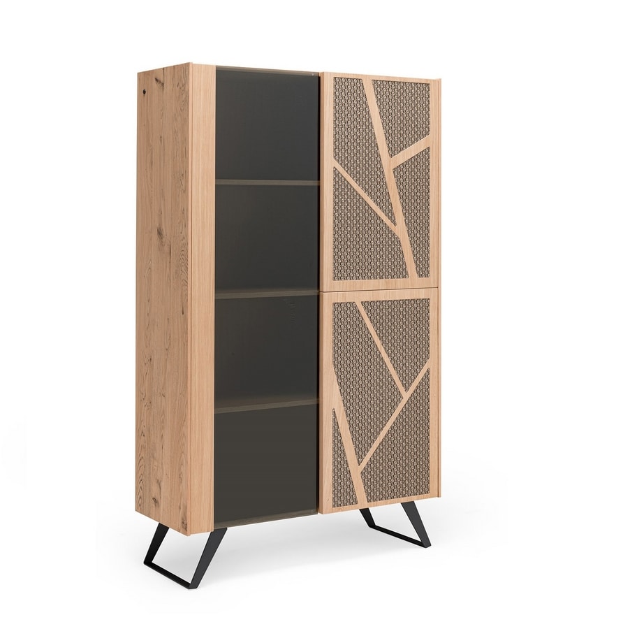 Schale in zwei Versionen erhältlich: Struktur- oder Eichenholz. Zwei Türen aus Eichenholz, die dritte aus 6 mm dickem, gehärtetem Rauchglas. Sockel aus pulverbeschichtetem oder oxidiertem Stahl mit Acryl-Finish.