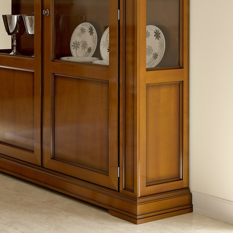 Klassische Holzvitrine mit zwei Doppelglastüren. Im geschlossenen Teil gibt es eine feste Trennwand und im Glasteil zwei Glasböden. Transparente und glatte Glastüren.