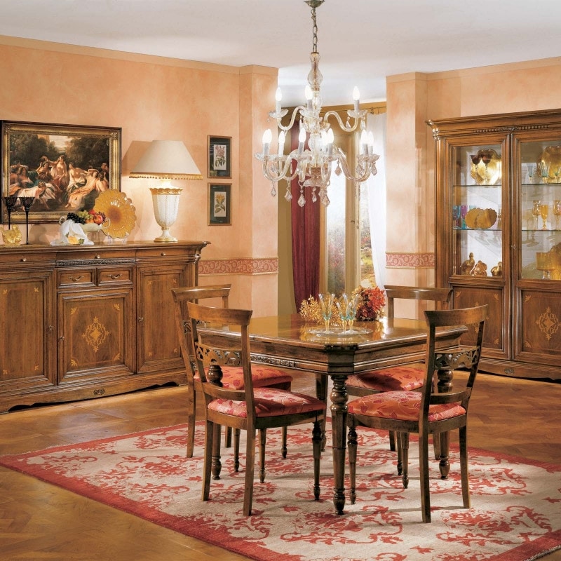 Die Kollektion „I Dogi di Venezia“ enthält Artikel für den Wohnbereich und den Schlafbereich. Dabei handelt es sich um sehr prestigeträchtige Möbelstücke, bei denen man den Reichtum der Schnitzerei und die Feinheit der Intarsien bewundern kann. Die gesamte Serie besteht aus hochwertigen Materialien wie Massivholz für die Türen und Profile, Tischlerholz für alle Paneele, Sperrholz für die Rückseiten und Tanne für die mit Schwalbenschwänzen gearbeiteten Schubladen. Bei diesen Artikeln sind klassische Ausführungen vorzuziehen.