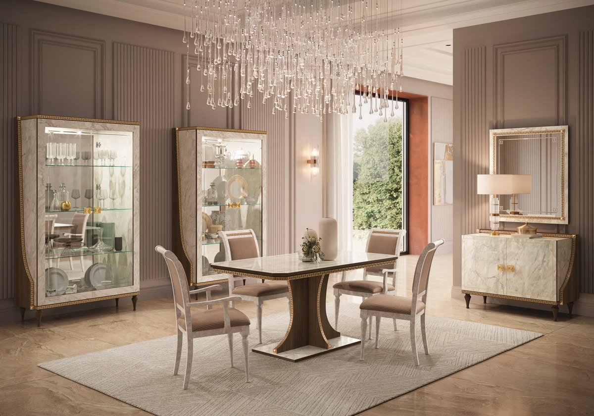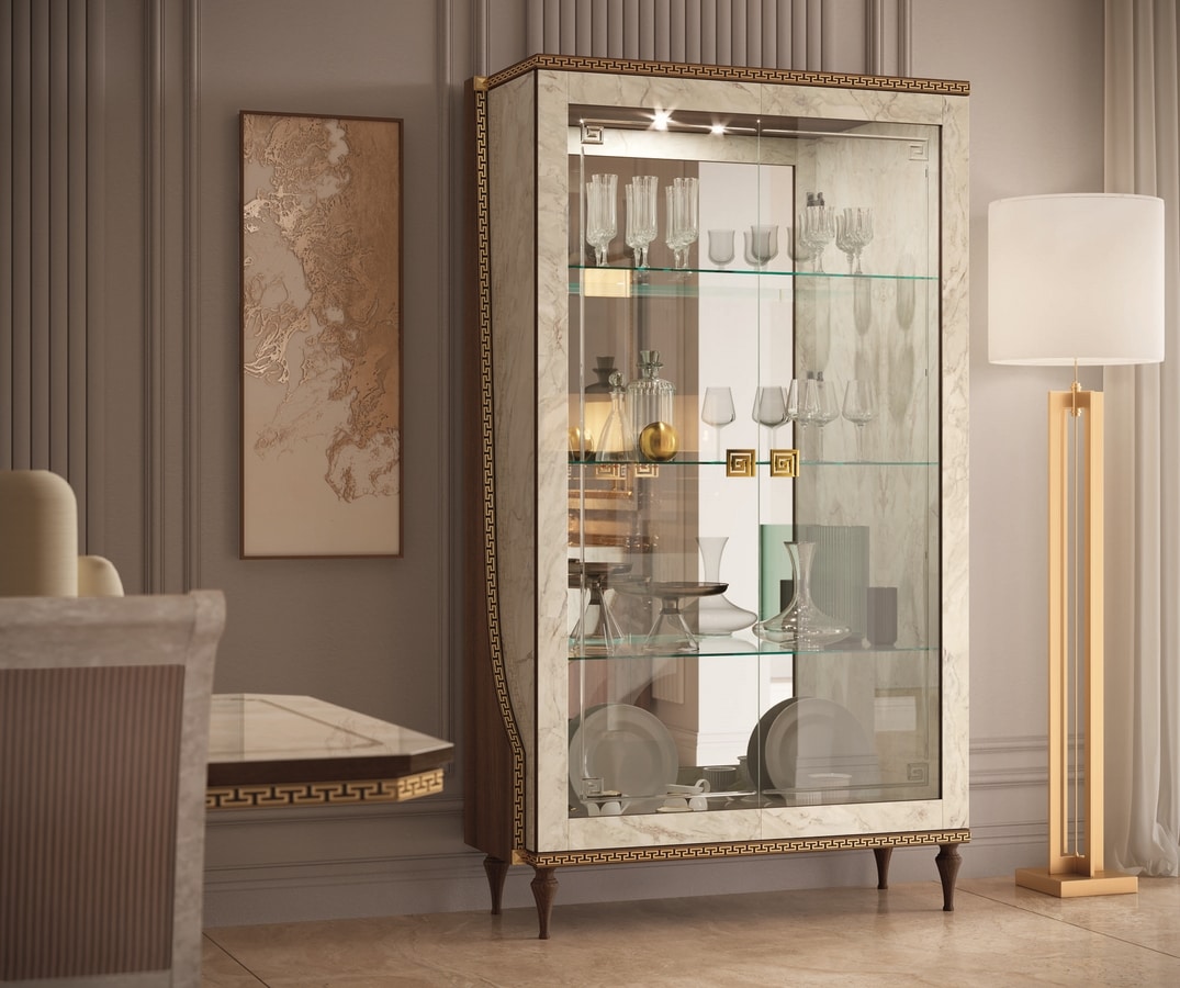 Die Seite in Walnussholzoptik umschließt die Innenstruktur aus glänzendem Carrara-Marmor und erweckt eine raffinierte Farbkombination zum Leben, die durch das neoklassizistische griechische Bündnis in Goldoptik verschönert wird. Die Liebe zum Detail macht die Vitrine zum Hauptdarsteller des Wohnzimmers. Die Kristalle, die Glastüren, die verspiegelte Rückwand und die 24-Karat-plattierten Griffe sorgen für unerwartete Blendungen und raffinierte Lichtspiele.