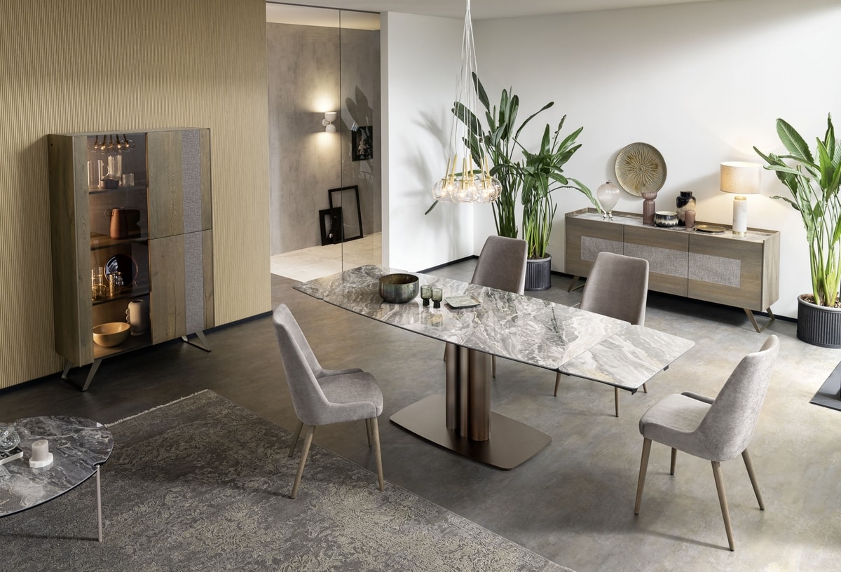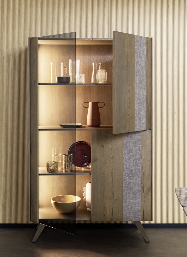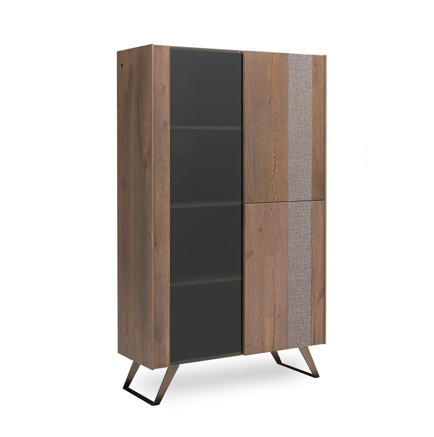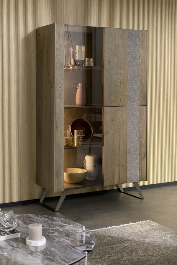 Schale in zwei Versionen erhältlich: Struktur- oder Eichenholz. Zwei Türen aus Eichenholz, die dritte aus 6 mm dickem, gehärtetem Rauchglas. Sockel aus pulverbeschichtetem oder oxidiertem Stahl mit Acryl-Finish.