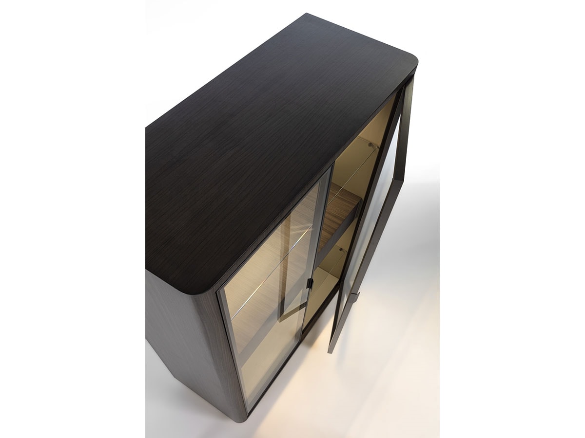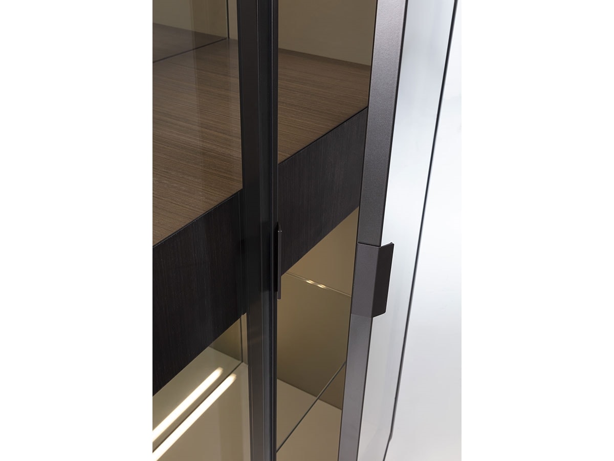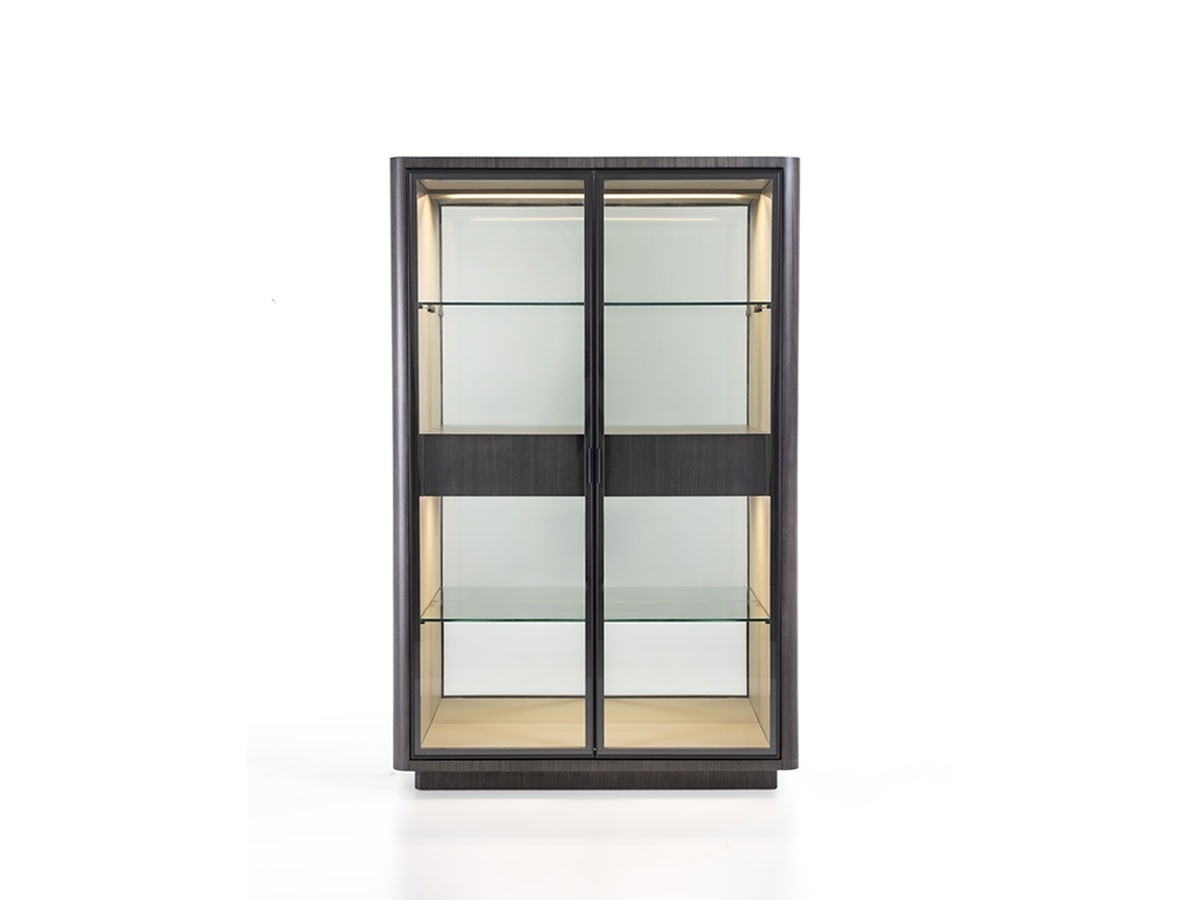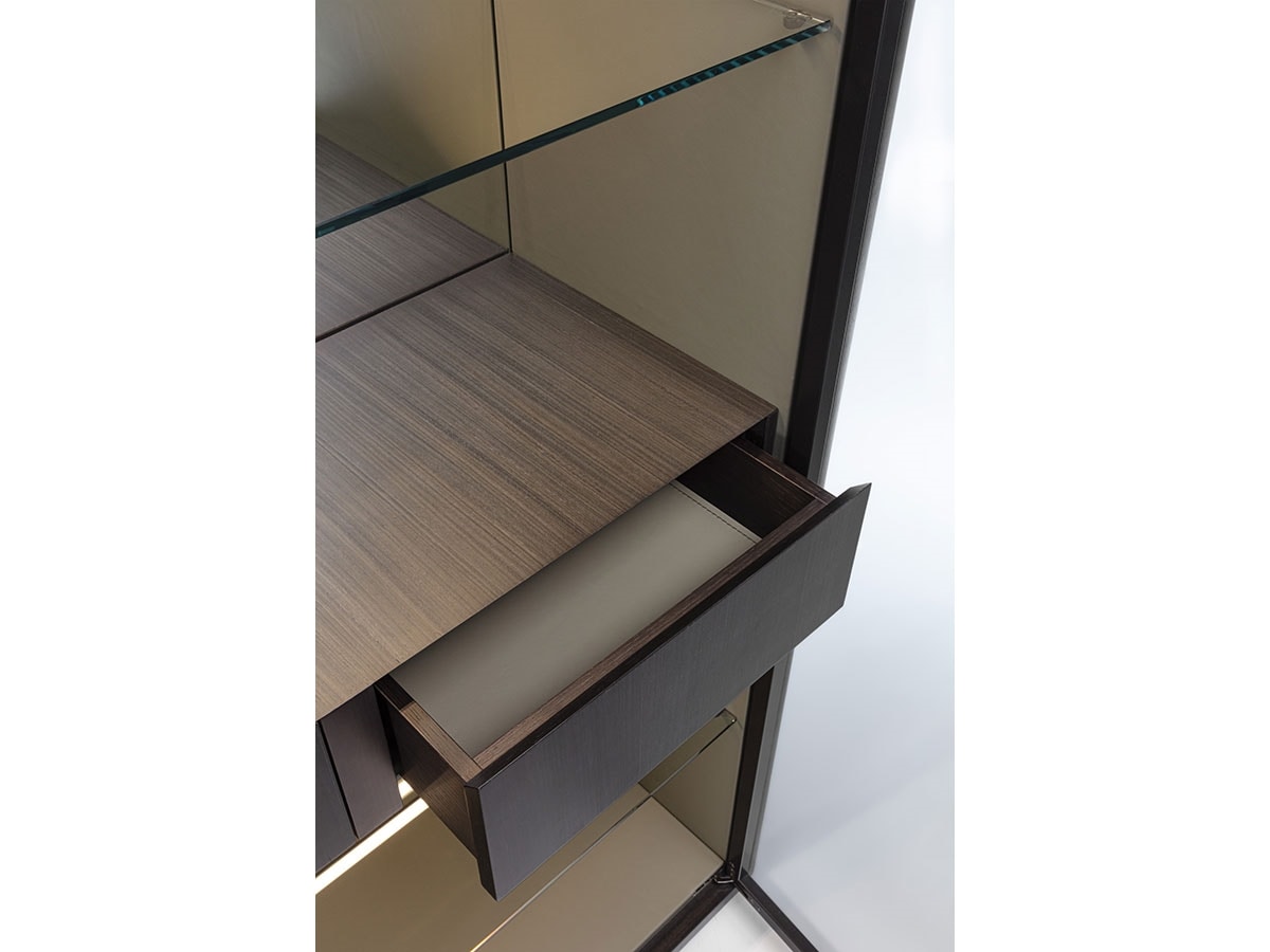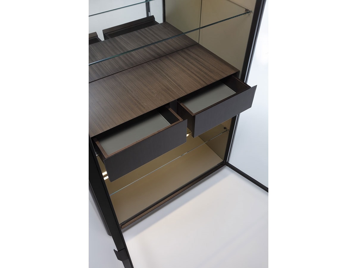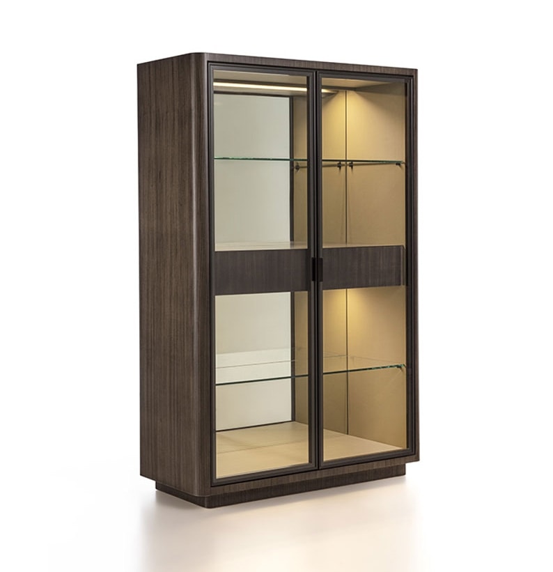 Vitrine mit elegantem, geradlinigem Design. Die äußere Struktur wird durch die Verkleidung in dunklem Tay (VE50B) und durch die Details der abgerundeten Ecken verschönert. Der Innenraum zeichnet sich durch die Qualität der Details aus, Innenschubladen in dunklem Tay, Innenstruktur mit Lederbezug, verspiegelte Rückwand und Türen mit Aluminiumprofil. Auch in hellem Tay (VE50C) und Canaletta-Walnuss (VE50) erhältlich. Beleuchtung auf Anfrage.