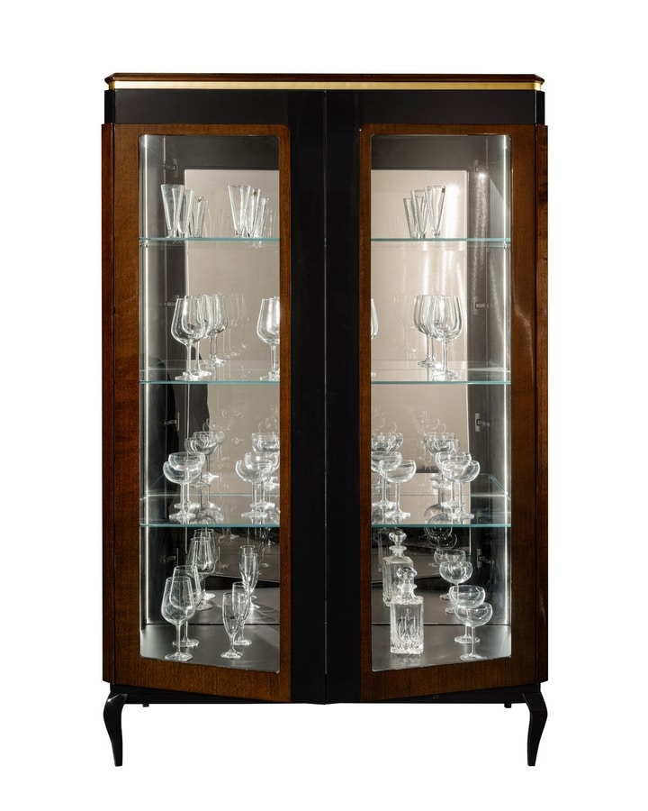 Preise anfordern Ähnliche ProdukteVitrine mit 2 Glastüren, Eschenfurnier. Metallprofile. Erhältlich in den glänzenden Oberflächen Imperador Mokka und Elfenbeinsand. Lackierter Innenraum mit Glasregalen und verspiegelter Rückseite. Innenbeleuchtung. Griffe aus Holz und Metall.