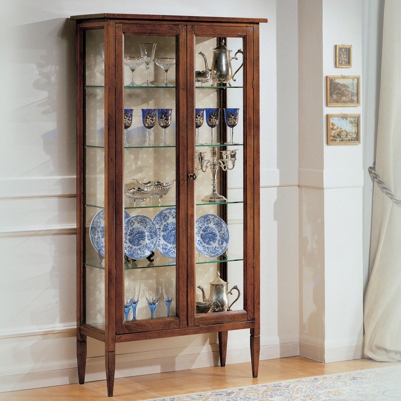 Vitrine mit Seiten und zwei Türen aus transparentem und glattem Glas. Stachelbeine und linearer Sockel. Im Inneren der Vitrine befinden sich vier Glasböden. Dieses schlichte Möbelstück im klassischen Stil ermöglicht es Ihnen, die elegantesten Häuser mit Geschmack und Raffinesse einzurichten. Diese Möbelstücke werden oft in moderne Einrichtungsgegenstände eingefügt, um einen angenehmen Stilkontrast zu schaffen.
