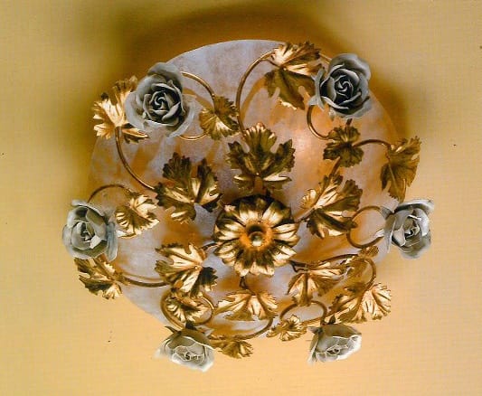 Deckenleuchte mit 6 Leuchten, mit Dekorationen in Gold und Antikweiß.