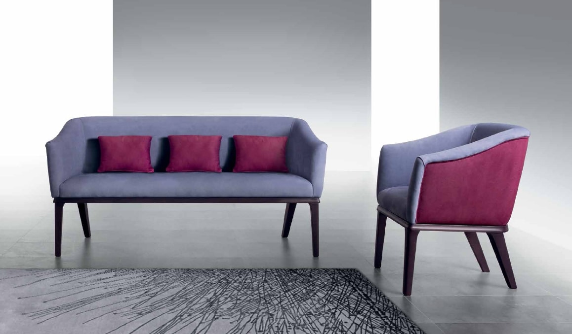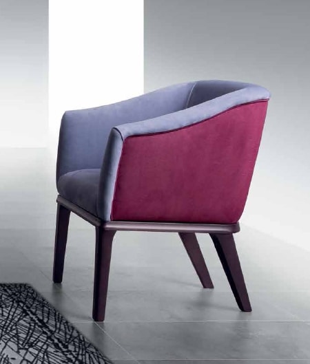 Sessel-Kollektion mit Holzstruktur, die mit einer Schicht Polyurethan bedeckt ist. Der maximale Sitzkomfort wird durch das Ineinandergreifen von elastischen Gurten bestimmt. Füße in Holz in Sycomoro-Dark-Finish (F123). Die Abdeckung der Außenschale ist glatt. Bezug in Stoff oder Leder erhältlich.