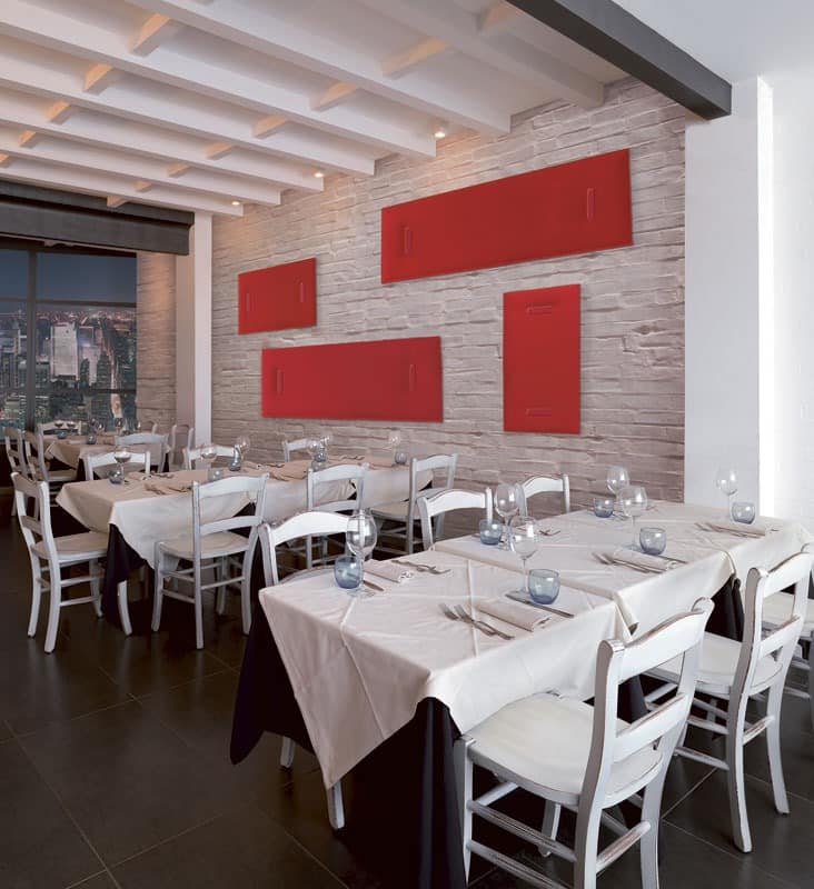 Schallabsorbierendes Paneel mit Polyester-Füllmaterial und Polyester-Bezug aus Trevira CS®-Material. Die Grundlage der patentierten Snowsound® Technologie besteht aus der Verwendung von Materialien unterschiedlicher Dichte. Diese Materialien absorbieren die unterschiedlichsten Frequenzbereiche und ermöglichen trotz geringer Materialstärke eine Verbesserung der Raumakustik. Die Mitesco Paneele sind, ohne Rahmen oder Nähte, aus einem Stück gefertigt, besonders leicht und passen sich an jedes Ambiente an.