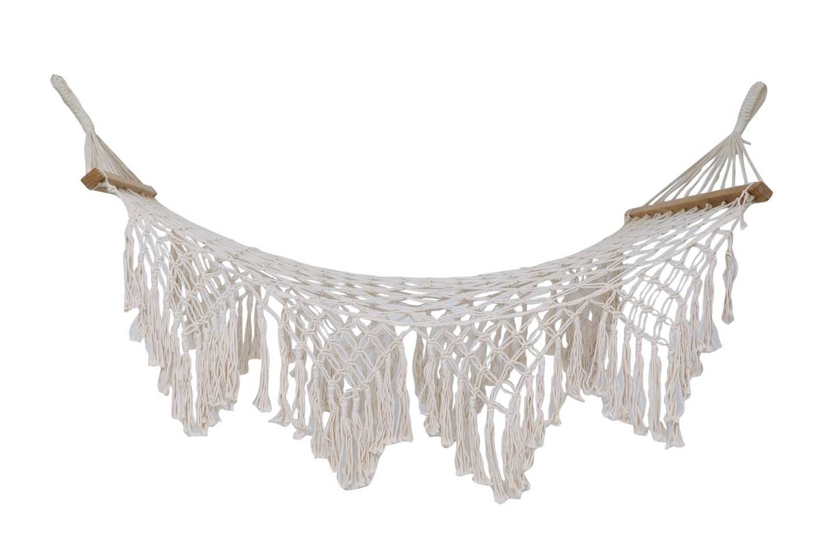 Outdoor-Hängematte aus Acrylseil, erhältlich in der Farbe Ecru, von Hand mit der Makramee-Technik gewebt und geknotet. Holzteile mit fein geschliffener Oberfläche. Diese mit Makramee-Weberei verzierte Hängematte passt perfekt in jede Umgebung, auch in die eleganteste.